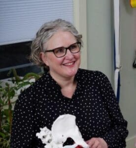 A woman with short gray hair wearing a blue top stands indoors, smiling at the camera. A green potted plant is visible in the background.